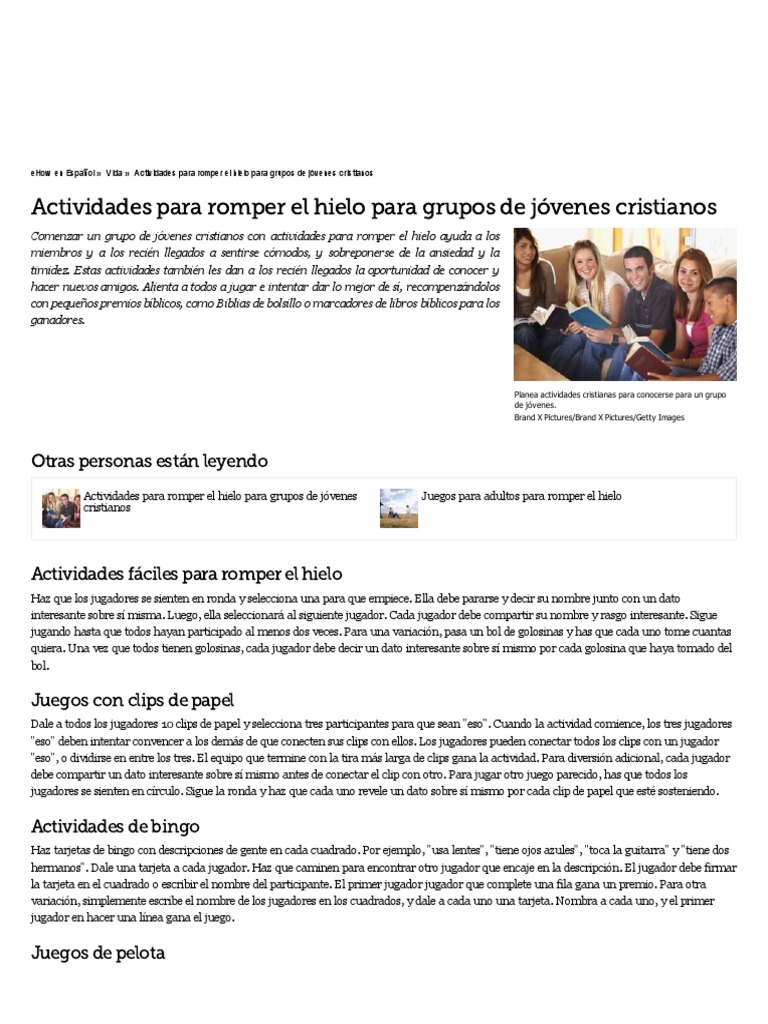Estas actividades también les dan a los recién llegados la oportunidad de conocer y hacer nuevos amigos. Los acertijos, actividades y juegos son una forma de romper el hielo, divertirse y aprender en tu ministerio de mujeres. Esta es muy buena para romper el hielo y dar el primer paso al intento de desarrollo de la comunicación entre los jóvenes. Sin embargo, se debe ser muy metódico y estratégico tanto al proponerla como en la medida de su curso. Esta dinámica también nos sirve para un par de cosas: Se le llaman dinámicas, actividades o juegos aquellas acciones que tienen un papel relevante o de importancia en los jóvenes cristianos cuando se reúnen en sus congregaciones o círculos de amistades, estas actividades ayudan a los jóvenes e muchos aspectos entre ellos están: About press copyright contact us creators advertise developers terms privacy policy & safety how youtube works test new features press copyright contact us creators. Tambien son un gran medio para romper el hielo entre un grupo de personas que no conocen muy bien. Nuestra misión es proporcionarte una recopilación de las mejores dinámicas cristianas para tus eventos , tales como conferencias , reuniones de jóvenes , veladas de oración y para toda ocasión en la cual quieras dejar una enseñanza o reflexión cristiana. Juegos para romper el hielo pasamos el globo con una parte del cuerpo. La razón es porque podría llegar a ser incómoda para muchos, por lo que se debería motivar al joven a formar. 3 dinamicas on line para hacer en zoom u otras redes sociales celulas online , por ejemplo. Ejercicio rompe hielo al integrar un grupo nuevo participantes: